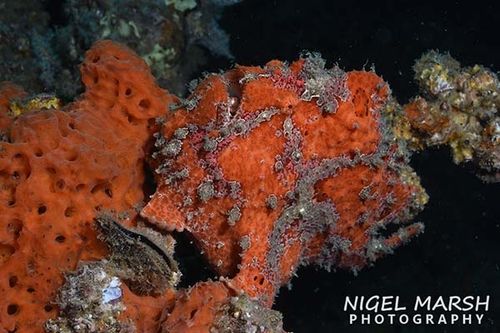 The only information I had was that it had been seen near the stern, somewhere on the deck. Knowing how well camouflaged these fish are I wasn’t confident that I could find it. I searched high and low for ten minutes, inspecting every sponge and coral it could hide on. And then I saw it, and much to my surprised it stood out like a sore thumb. As this bright orange Painted Frogfish (Antennarius pictus) was not sitting on a similar coloured sponge, but on the plain algae covered deck.