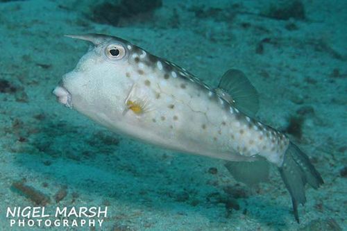 The Horn-nose Boxfish (Ostracion rhinorhynchos) is a rarely seen tropical boxfish that is mostly found in Southeast Asia. This species is also found in Australia, but mainly in areas that few divers venture, the Northern Territory and northern Western Australia. The Horn-nose Boxfish grows to 35cm long and is a white-creamy colour with darker spots and a brown honeycomb pattern. This species has a strange lump on its face that looks like an over-sized nose.